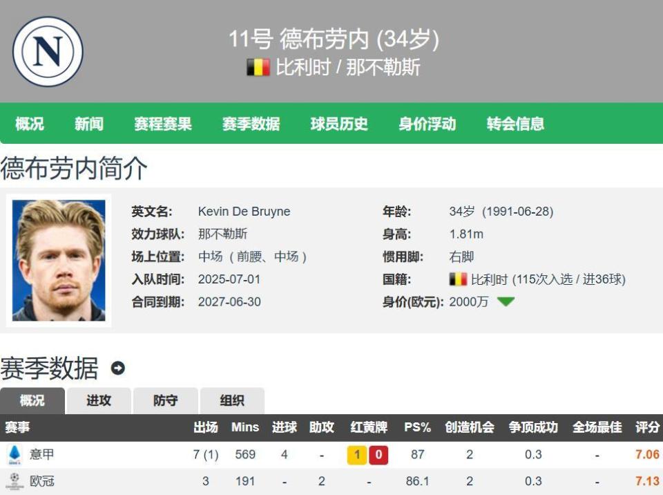 德布劳内本赛季加盟那不勒斯之后,8轮意甲全勤,其中7次首发,合计出场569分钟,打入了4球,但作为前英超最强做饼机器,联赛0助攻就有点奇怪了;还出战了全部的3轮欧冠,没有进球,但送出了2次助攻。